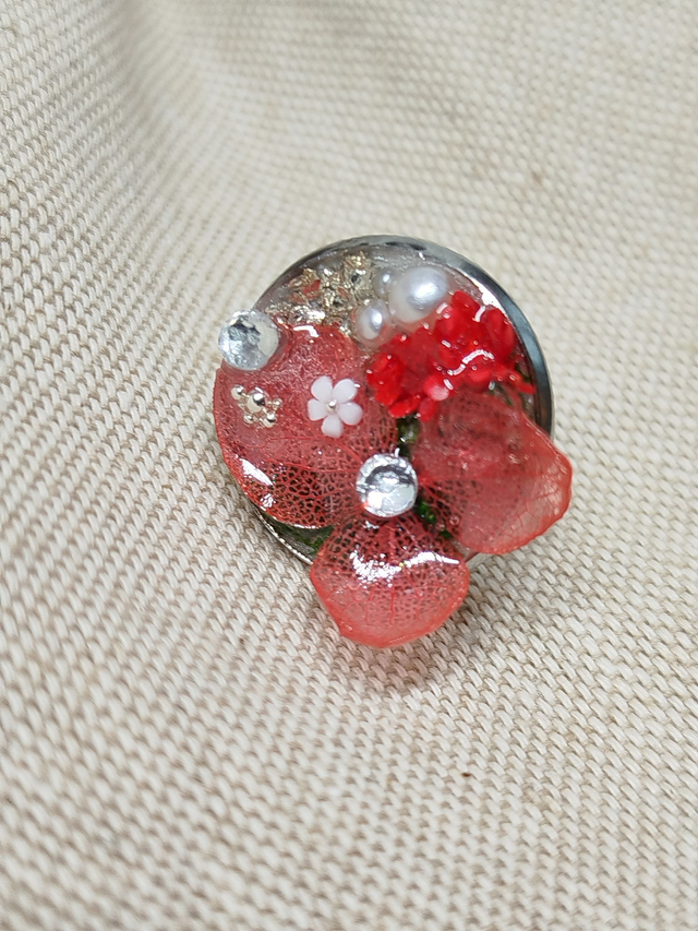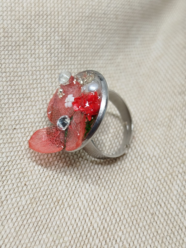 Chaque bague enferme de véritables fleurs séchées et des feuillages fins; le tout scellé dans une résine cristalline qui préserve leur couleur et leur forme pour l'éternité.