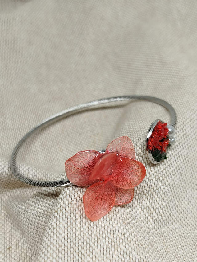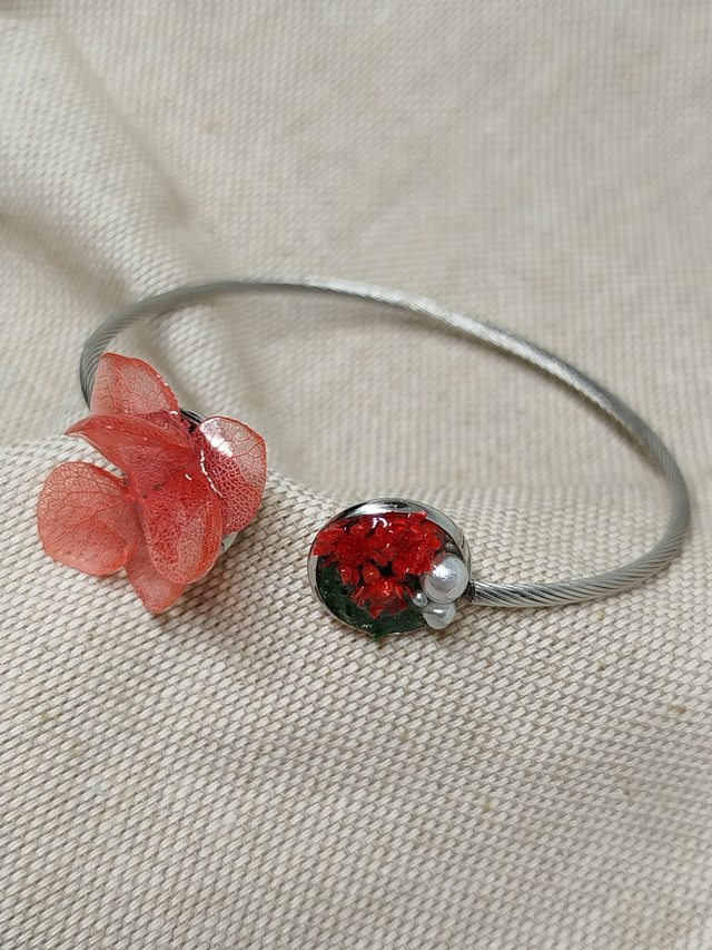 Découvrez les bracelets à manchette ouverts où chaque pièce est une œuvre d'art unique, mettant en vedette de véritables fleurs séchées et délicates, enfermées dans une résine cristalline pour préserver leur beauté pour toujours.