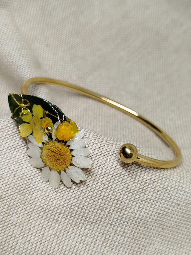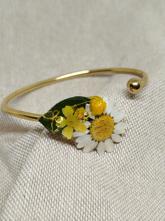 Découvrez les bracelets à manchette ouverts où chaque pièce est une œuvre d'art unique, mettant en vedette de véritables fleurs séchées et délicates, enfermées dans une résine cristalline pour préserver leur beauté pour toujours.