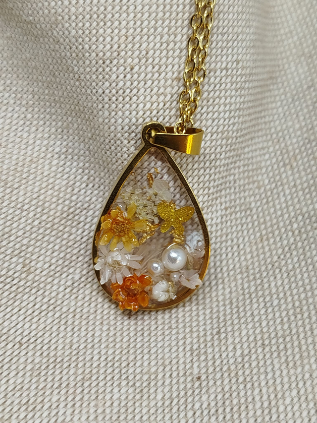 Découvrez la collection de colliers en résine UV, où de véritables fleurs séchées, des feuilles délicates, et des touches de paillettes sont encapsulées pour l'éternité.