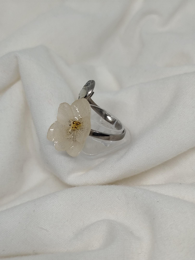 Chaque bague enferme de véritables fleurs séchées et des feuillages fins; le tout scellé dans une résine cristalline qui préserve leur couleur et leur forme pour l'éternité.