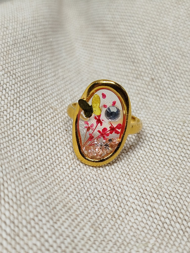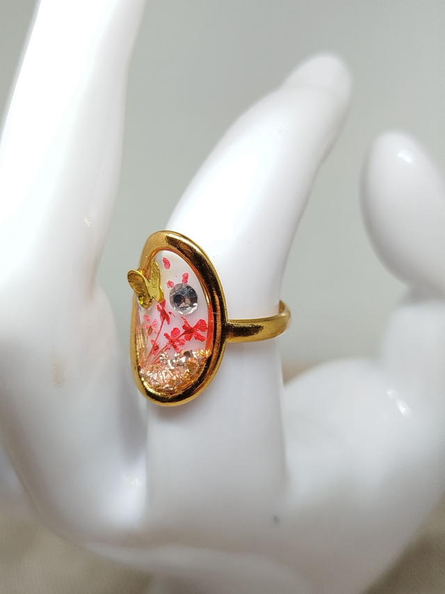 Chaque bague enferme de véritables fleurs séchées et des feuillages fins; le tout scellé dans une résine cristalline qui préserve leur couleur et leur forme pour l'éternité.