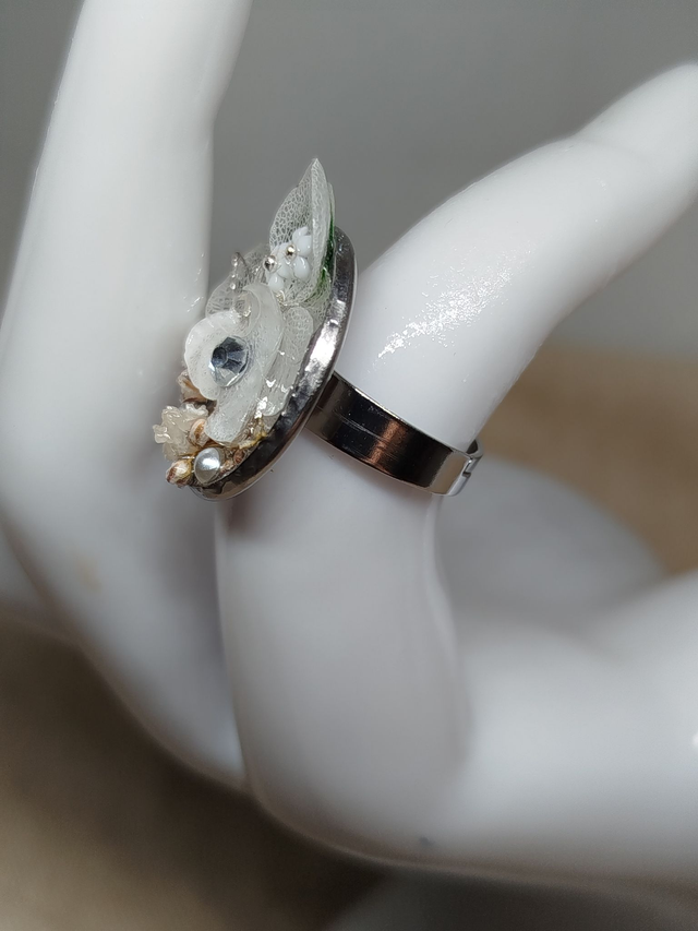Chaque bague enferme de véritables fleurs séchées et des feuillages fins; le tout scellé dans une résine cristalline qui préserve leur couleur et leur forme pour l'éternité.