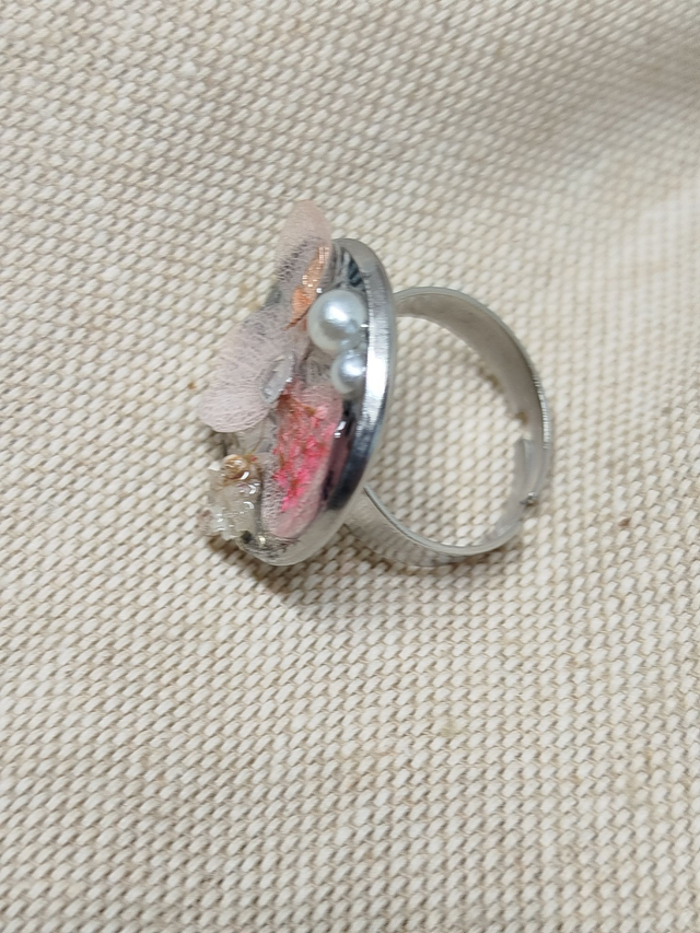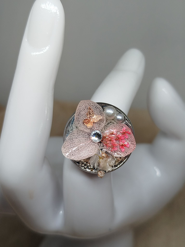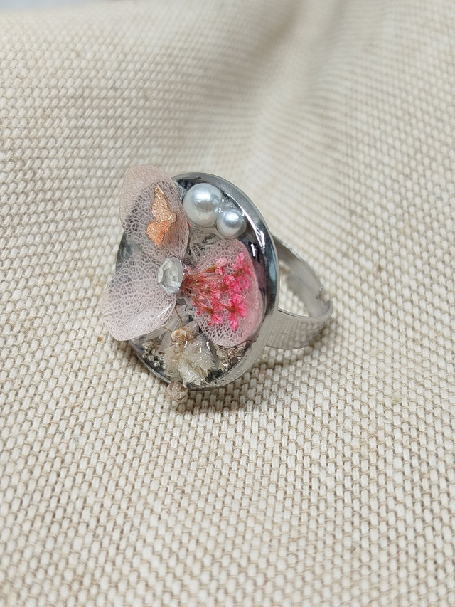 Chaque bague enferme de véritables fleurs séchées et des feuillages fins; le tout scellé dans une résine cristalline qui préserve leur couleur et leur forme pour l'éternité.